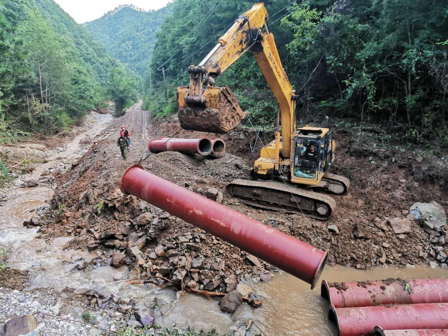 王家坪尾礦輸送管線在此次強(qiáng)降雨中受損最為嚴(yán)重,1號(hào)涵洞出入口、3號(hào)涵洞出口、4號(hào)涵洞入口被泥石流掩埋,尾礦輸送管道和壩下回水管道毀壞嚴(yán)重。金鉬建設(shè)針對(duì)涵洞內(nèi)空間狹小、淤泥量大,沿線塌方較多,大型機(jī)械無法通行,人工作業(yè)效率低等一系列難題,及時(shí)調(diào)整搶修方案,緊急購置、租賃小型挖掘、破除設(shè)備進(jìn)行清理作業(yè),經(jīng)過搶險(xiǎn)人員10余個(gè)晝夜輪班,克服連續(xù)降雨、塌方、洪水等困難,組織近300人配合小機(jī)械作業(yè),全力展開涵洞清淤、管道恢復(fù)作業(yè)。8月20日,王家坪尾礦輸送管線疏通修復(fù)完成,為恢復(fù)生產(chǎn)贏得時(shí)間。