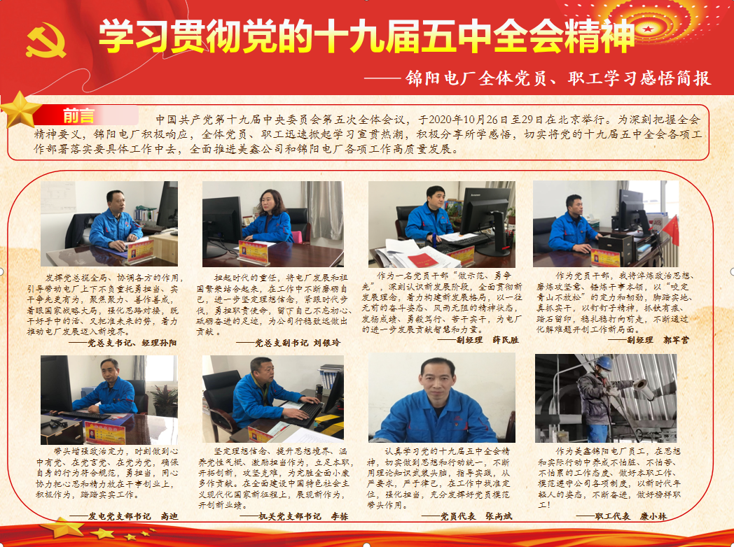 在公司宣講團(tuán)示范下,各基層單位多措并舉提高宣講實(shí)效:錦陽電廠黨總支通過動(dòng)員部署、理論宣講、創(chuàng)辦感悟簡(jiǎn)報(bào)等形式,指導(dǎo)職工認(rèn)真學(xué)習(xí)領(lǐng)會(huì)全會(huì)精神;陽極分公司黨總支成立宣講工作組,深入車間、班組一線,推動(dòng)學(xué)習(xí)貫徹五中全會(huì)精神向一線延伸拓展……一場(chǎng)場(chǎng)形式多樣、具體務(wù)實(shí)的宣講活動(dòng),持續(xù)推動(dòng)全會(huì)精神進(jìn)入思想進(jìn)入一線。