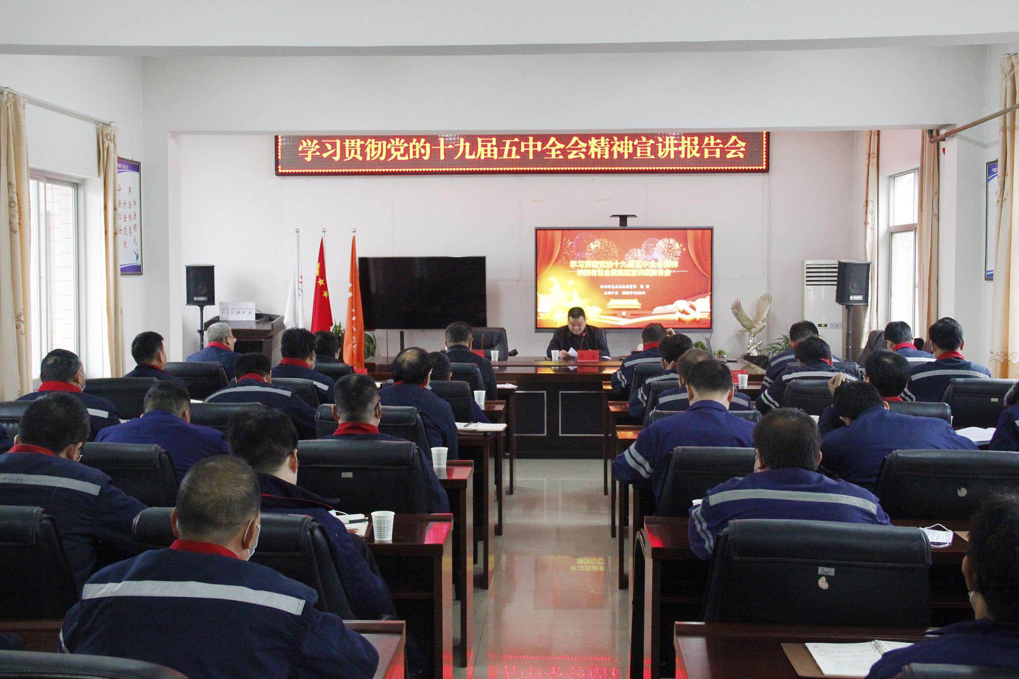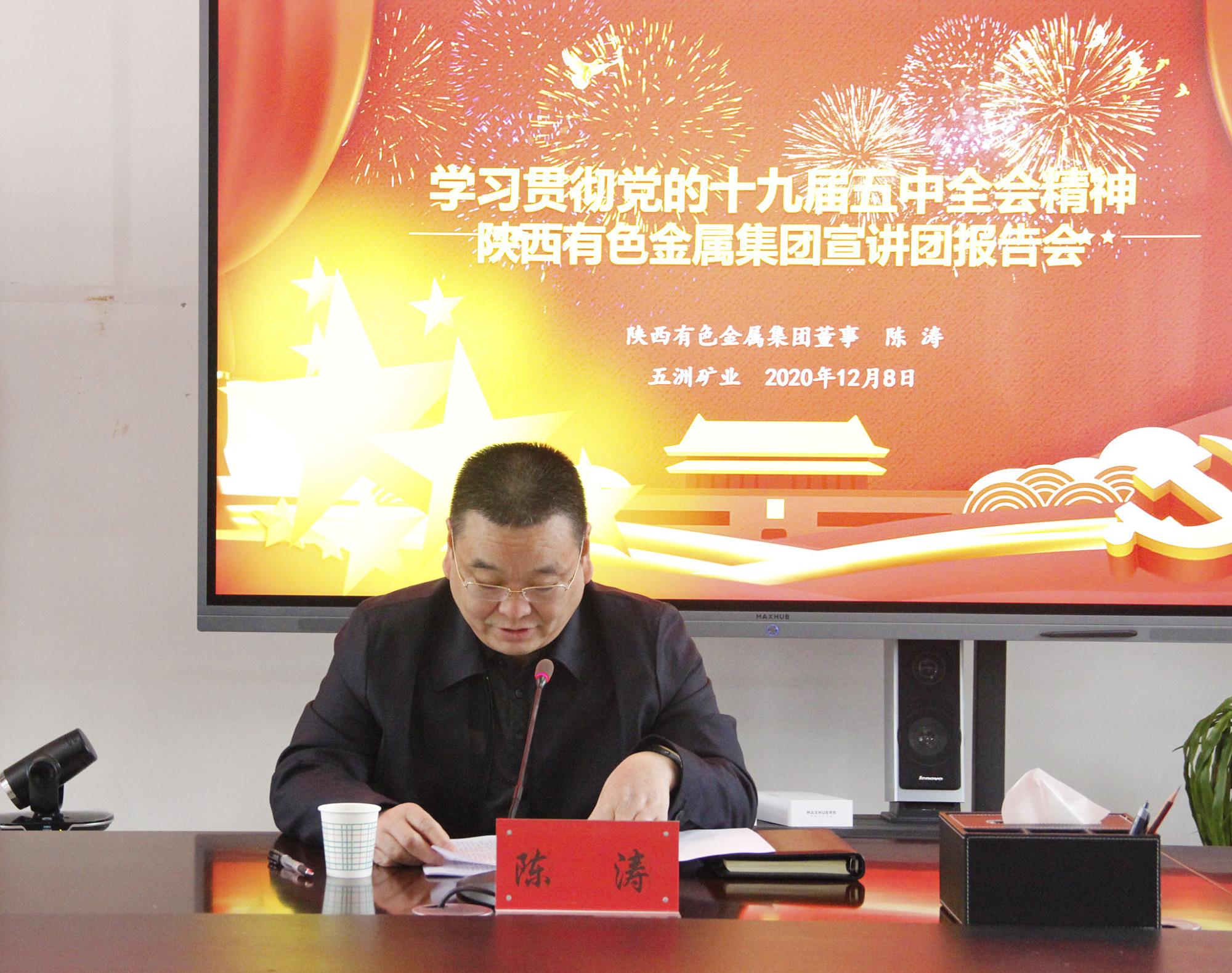 12月8日,學(xué)習(xí)貫徹黨的十九屆五中全會精神陜西有色金屬集團(tuán)宣講團(tuán)報(bào)告會在五洲礦業(yè)舉行。陜西有色金屬集團(tuán)宣講團(tuán)成員、董事陳濤作宣講報(bào)告,五洲礦業(yè)黨委書記、董事長張景奇主持。