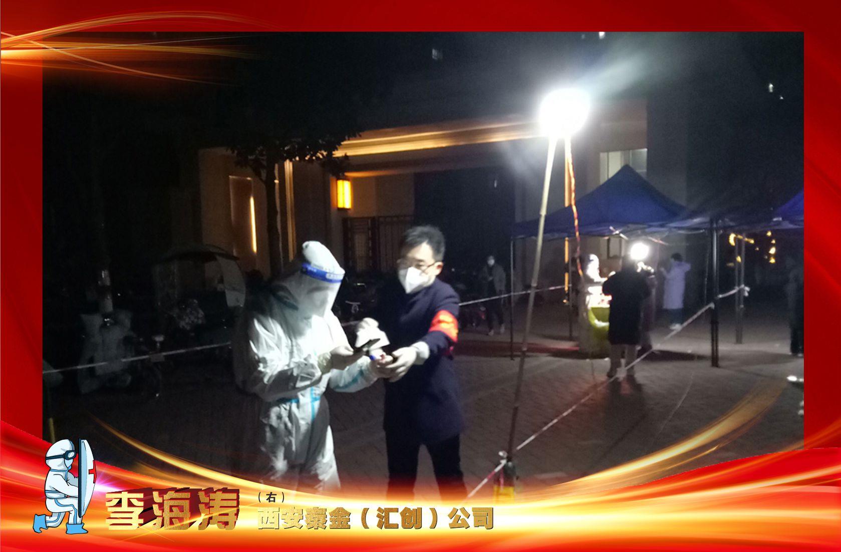 晚上9點(diǎn)多,在延興門社區(qū)海倫國際小區(qū)值勤的黃金集團(tuán)西安秦金(匯創(chuàng))公司副總經(jīng)理李海濤反復(fù)核實(shí)核酸檢測(cè)信息。夜里氣溫低,他冷的想打哆嗦,手指頭僵硬的像沒了感覺。跺跺腳、搓搓手,寒風(fēng)里始終堅(jiān)守著崗位,只為更多的家庭“宅”的放心,睡的安穩(wěn)。