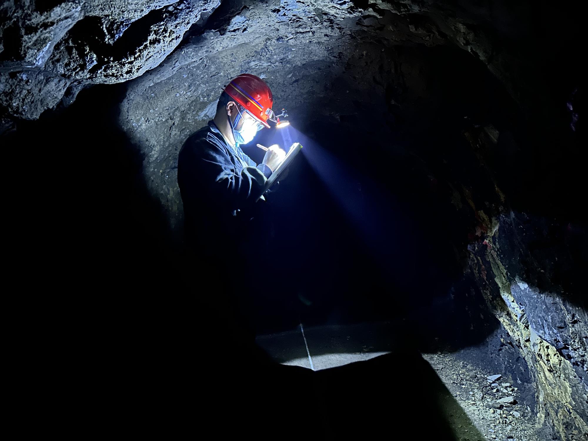 當寨子溝礦區(qū)樣品送檢后,坑道成了我的另一個課堂。師父教我測量各類產(chǎn)狀,教我展點和產(chǎn)狀,教我如何勾畫地質(zhì)界線……水珠從坑道頂板滴落,在礦燈光束里拉出銀線。師父的筆尖在巖壁上游走如活物,筆尖順層理滑動,在圖紙上旋出流暢的曲線?;璋倒饩€下,那墨線竟有了生命般微微搏動——巖石的密碼被解開一道縫隙,礦脈的暖流正滲出石壁。地質(zhì)錘叩擊巖壁的顫音未散,巖石紋層間簌簌剝落的碎屑里,恍有古河道裹挾風沙的呼嘯掠過指腹。