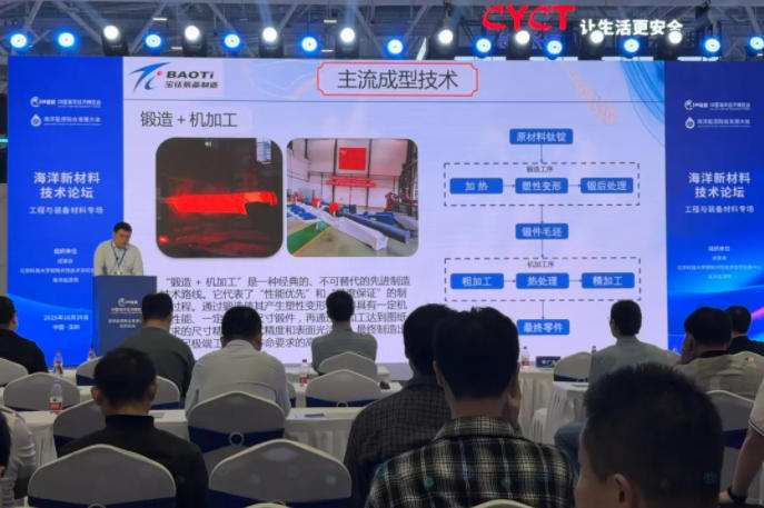 展會期間,寶鈦股份營銷部門與寶鈦研究院專家團隊緊密配合,為來自全球的海洋裝備制造商及科研機構(gòu)提供從技術(shù)咨詢到商務(wù)洽談的一站式專業(yè)服務(wù)。在“海洋新材料技術(shù)論壇——工程與裝備材料專場”上,裝備制造公司趙彤作專題技術(shù)報告,分享了寶鈦在高端裝備材料應(yīng)用方面的最新研究成果。