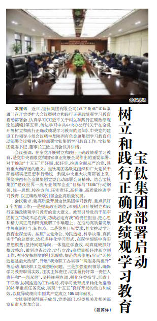 會(huì)議強(qiáng)調(diào),在全黨開展樹立和踐行正確政績觀學(xué)習(xí)教育,是黨中央著眼黨和國家事業(yè)發(fā)展全局作出的重要部署,對(duì)于推動(dòng)“十五五”開好局、起好步,推進(jìn)全面從嚴(yán)治黨,具有重大而深遠(yuǎn)的意義。寶鈦集團(tuán)各級(jí)黨組織和廣大黨員干部要切實(shí)把思想和行動(dòng)統(tǒng)一到黨中央重大決策部署上來,圍繞陜西有色金屬集團(tuán)黨委啟動(dòng)部署會(huì)議精神,結(jié)合寶鈦集團(tuán)“建設(shè)世界一流專業(yè)領(lǐng)軍企業(yè)”目標(biāo)與“1345”行動(dòng)綱領(lǐng),統(tǒng)一思想、校準(zhǔn)方向、壓實(shí)責(zé)任,高標(biāo)準(zhǔn)、高質(zhì)量推進(jìn)學(xué)習(xí)教育,以正確政績觀引領(lǐng)企業(yè)高質(zhì)量發(fā)展。
