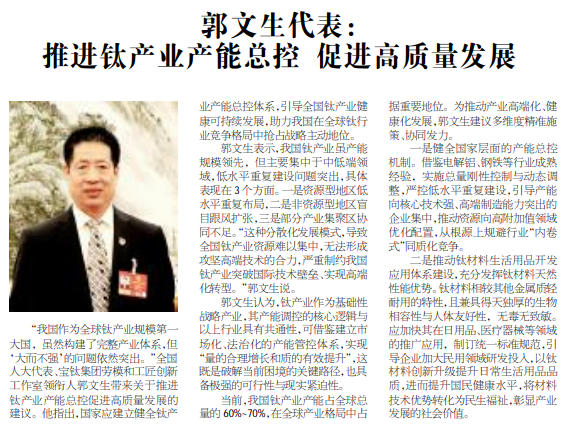 “我國作為全球鈦產(chǎn)業(yè)規(guī)模第一大國,雖然構(gòu)建了完整產(chǎn)業(yè)體系,但‘大而不強(qiáng)’的問題依然突出。”全國人大代表、寶鈦集團(tuán)勞模和工匠創(chuàng)新工作室領(lǐng)銜人郭文生帶來關(guān)于推進(jìn)鈦產(chǎn)業(yè)產(chǎn)能總控促進(jìn)高質(zhì)量發(fā)展的建議。他指出,國家應(yīng)建立健全鈦產(chǎn)業(yè)產(chǎn)能總控體系,引導(dǎo)全國鈦產(chǎn)業(yè)健康可持續(xù)發(fā)展,助力我國在全球鈦行業(yè)競爭格局中搶占戰(zhàn)略主動地位。