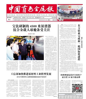 2016年6月1日~7日,由陜西有色集團(tuán)下屬寶鈦集團(tuán)研制的4500米深潛器鈦合金載人球艙,參加了主題為“創(chuàng)新驅(qū)動(dòng)發(fā)展、科技引領(lǐng)未來”的國(guó)家“十二五”科技創(chuàng)新成就展,習(xí)近平總書記、李克強(qiáng)總理等黨和國(guó)家領(lǐng)導(dǎo)人參觀了展覽,并對(duì)寶鈦研制的深潛器鈦合金載人球艙給予充分肯定,并提出殷切希望。國(guó)家領(lǐng)導(dǎo)人到展臺(tái)來參觀和對(duì)企業(yè)的勉勵(lì),讓有色行業(yè)、鈦行業(yè),尤其是寶鈦人群情激奮、備感自豪,這也是對(duì)寶鈦科技創(chuàng)新及中國(guó)鈦工業(yè)發(fā)展的巨大鼓舞。