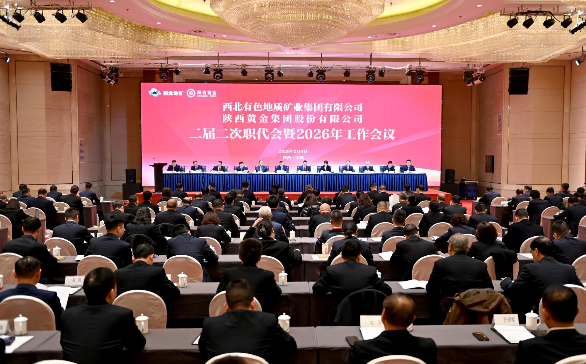 2月4日,地礦集團(tuán)、黃金集團(tuán)二屆二次職代會暨2026年工作會議在寶雞召開。會議認(rèn)真學(xué)習(xí)貫徹黨的二十大和二十屆歷次全會精神,傳達(dá)學(xué)習(xí)陜西有色金屬集團(tuán)三屆四次職代會暨2026年工作會議精神,全面總結(jié)“十四五”成績及2025年工作,深入分析當(dāng)前形勢,科學(xué)謀劃“十五五”發(fā)展思路和2026年重點任務(wù),動員全體干部職工銳意進(jìn)取、奮發(fā)有為,全力以赴完成年度目標(biāo)任務(wù),實現(xiàn)“十五五”良好開局。