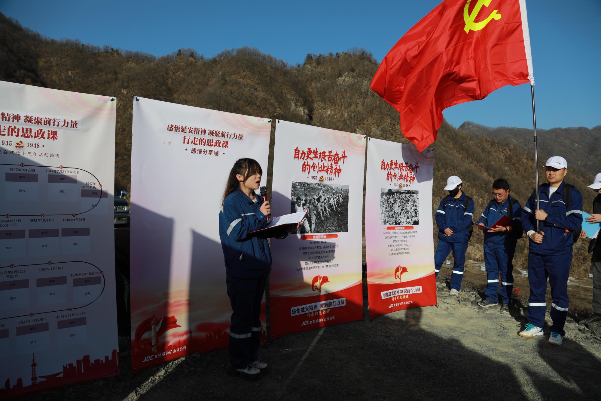 為確保思政課取得實實在在成效,金鉬集團(tuán)礦山分公司黨委提前籌劃,精心準(zhǔn)備,在總長約6公里的木子溝尾礦庫沿途,設(shè)置4個集合點,放置“堅定正確的政治方向、解放思想實事求是的思想路線、全心全意為人民服務(wù)的根本宗旨、自力更生艱苦奮斗的創(chuàng)業(yè)精神”四塊紅色展板,通過場景模擬、現(xiàn)場講述等方式,系統(tǒng)回顧在百年黨史中熠熠生輝的延安精神,滋養(yǎng)初心、淬煉靈魂。