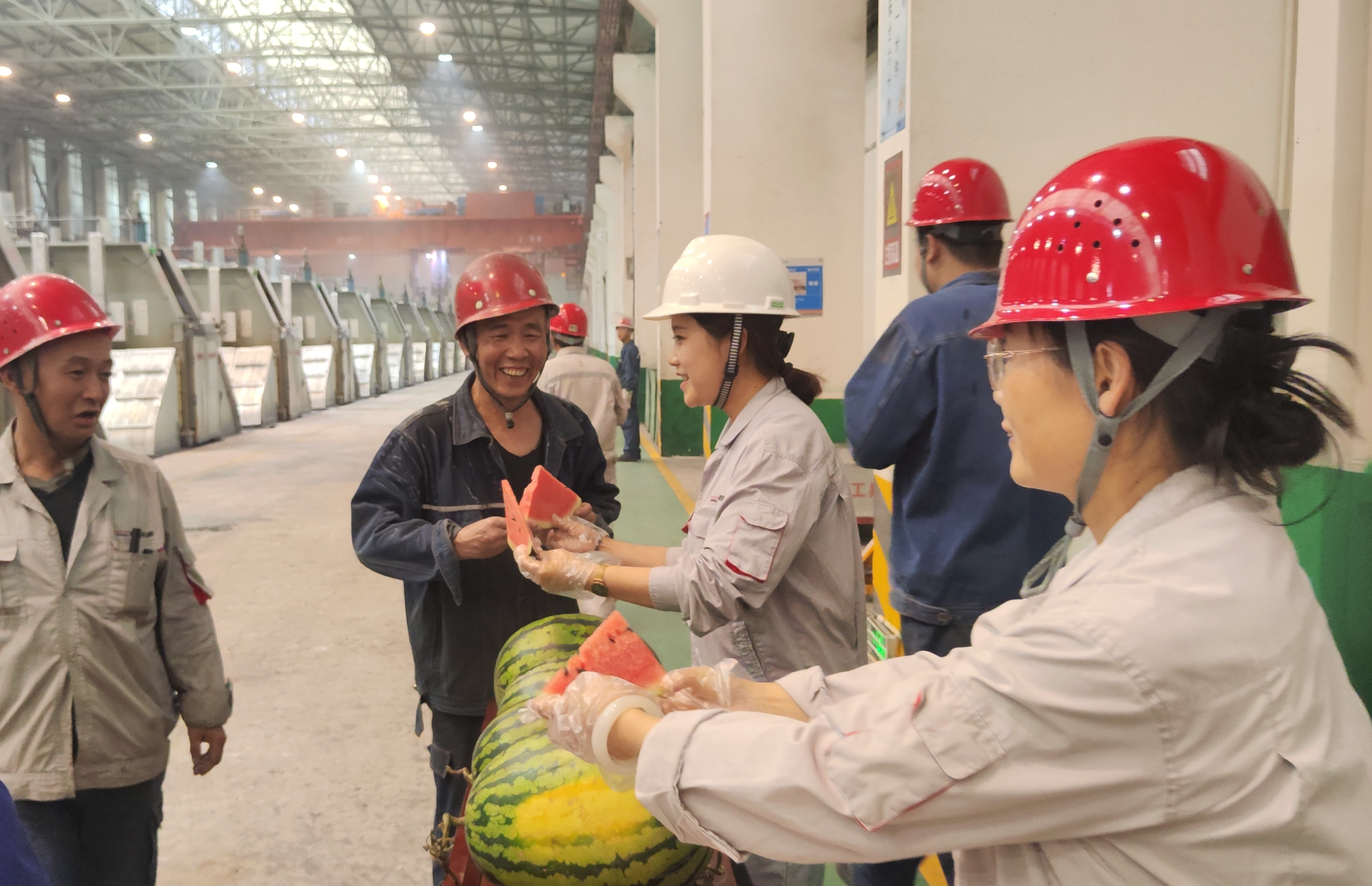 連日來驕陽似火,高溫天氣持續(xù)籠罩,陜西美鑫鋁鎂合金分公司生產(chǎn)一線一派繁忙景象,“奮戰(zhàn)二季度 實(shí)現(xiàn)雙過半”活動正如火如荼的進(jìn)行著。陜西美鑫公司女工委積極響應(yīng)公司黨政號召,6月14日下午,在鋁鎂合金分公司電解一、二車間開展“戰(zhàn)酷暑、保安全 與一線職工肩并肩”夏季送清涼活動,為奮戰(zhàn)在高溫一線的職工送去一絲清涼和一份關(guān)懷。