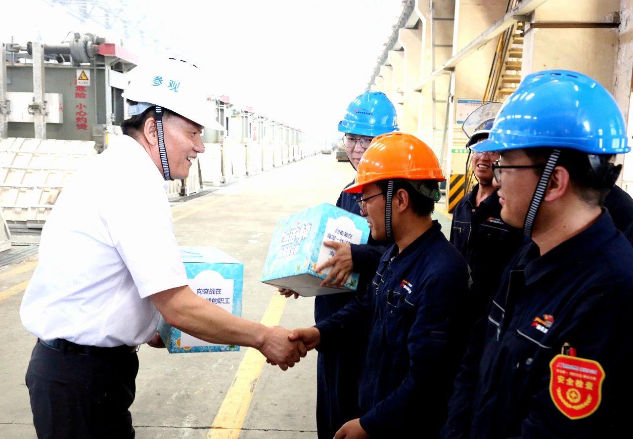樊樹森一行深入鋁業(yè)分公司電解一車間,實地察看產(chǎn)業(yè)工人的工作環(huán)境,親切慰問一線高溫崗位上的職工,為他們送上防暑降溫物品,叮囑大家注意防暑降溫,強化安全意識,確保安全生產(chǎn)。