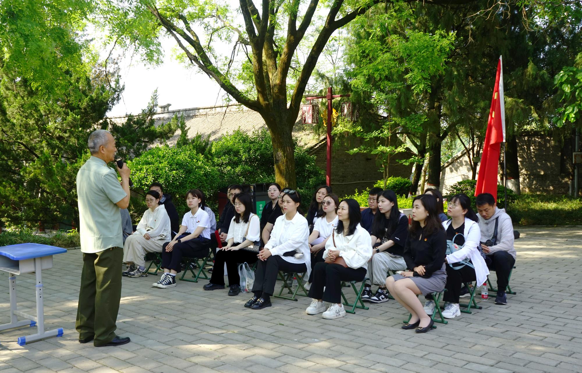 在起義舊址的大槐樹(shù)下,參加過(guò)中越邊境自衛(wèi)反擊戰(zhàn)的老兵陳乾明老師為青年們授課,飽含感情的講述將大家?guī)Щ貥屃謴椨甑膽?zhàn)場(chǎng),帶回硝煙四起的年代,也更讓青年們深切體悟到,我們習(xí)以為常的和平盛世,是千千萬(wàn)萬(wàn)保家衛(wèi)國(guó)的戰(zhàn)士負(fù)重前行換來(lái)的,而青年的使命,正是不辜負(fù)犧牲、不辜負(fù)厚望,為中華民族的偉大復(fù)興接續(xù)奮斗。