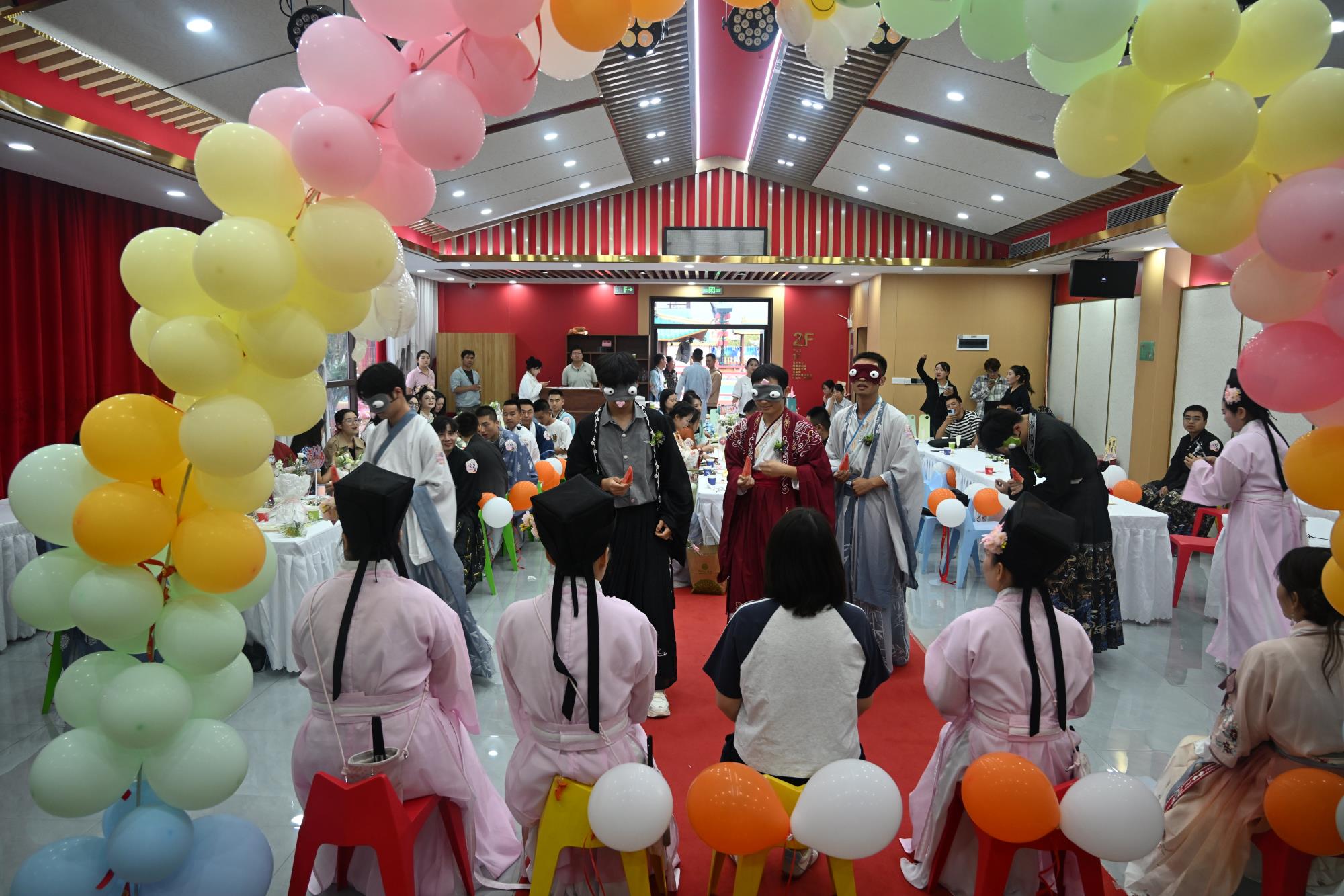 活動伊始,身著典雅漢服的青年男女在花月薈主入口簽到,領(lǐng)取專屬胸針與手環(huán),于古韻氛圍中沉浸式感受傳統(tǒng)文化魅力。在隨后的游園定向挑戰(zhàn)環(huán)節(jié),男女嘉賓在繽紛花海中合影留念,協(xié)力完成“終極考官”設(shè)定的趣味任務(wù);高潮迭起的“喜從天降拋繡球”點燃全場熱情,成功搶得繡球的嘉賓組成“繡球CP”;在小劇場二樓,“愛情實驗室”趣味游戲輪番上演,“桃花朵朵開”“蒙眼遞西瓜”……現(xiàn)場氣氛溫馨融洽。在主持人的鼓勵下,多位嘉賓勇敢表達心意,最終公司5名單身青年成功牽手,收獲全場熱烈掌聲與美好祝福。